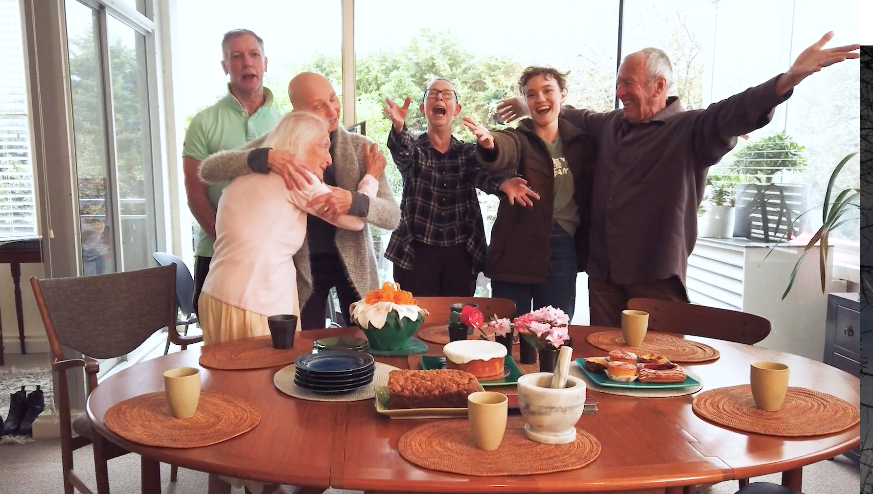 “Hello, Lewisburg!” Some of Eileen’s friends gather for tea and cake (left to right) Geoff Weston, Eileen, Anca Frankenhaeuser, Julia Cotton, Allie Graham, Patrick Harding-Irmer.